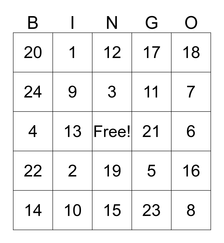 This bingo card has a free space and 24 words: 2, 10, 3, 14, 18, 20, 24, 1, 21, 19, 11, 4, 5, 16, 9, 23, 6, 12, 7, 13, 8, 22, 17 and 15.