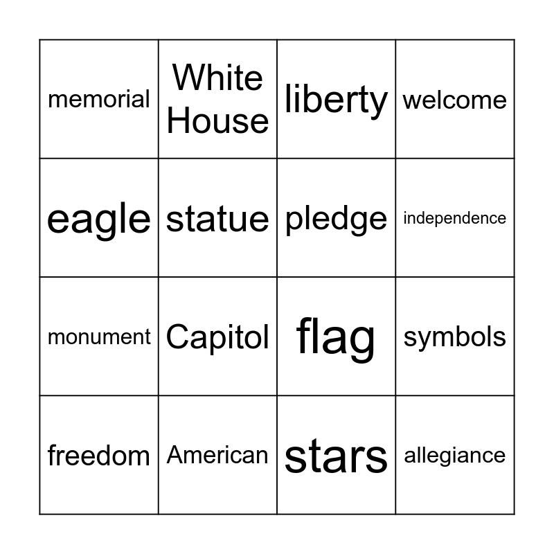This bingo card has 16 words: American, symbols, liberty, memorial, monument, White House, flag, stars, eagle, statue, freedom, welcome, Capitol, independence, pledge and allegiance.