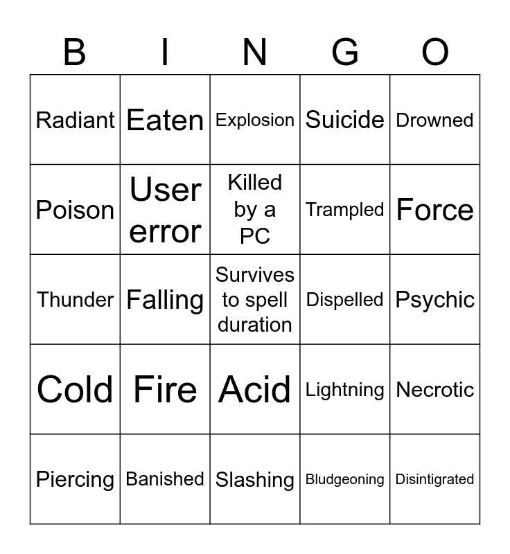 This bingo card has a free space and 24 words: Fire, Banished, Killed by a PC, Piercing, Drowned, Radiant, Poison, Eaten, Dispelled, Acid, Trampled, Thunder, Lightning, Necrotic, User error, Bludgeoning, Psychic, Explosion, Force, Falling, Disintigrated, Cold, Suicide and Slashing.