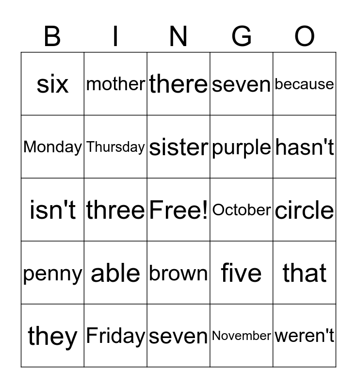 This bingo card has a free space and 112 words: one, two, three, four, five, six, seven, eight, nine, ten, red, yellow, blue, green, orange, purple, brown, black, white, them, they, there, when, which, doesn't, penny, Friday, we're, orange, Wednesday, six, three, one, dime, white, don't, May, square, been, August, then, over, can't, when, October, should, before, seven, they, five, what, November, red, nickel, January, again, mother, December, blue, that, purple, could, September, which, they're, February, cents, isn't, them, Sunday, man, hasn't, black, triangle, March, able, front, give, four, Tuesday, weren't, live, sister, Thursday, brown, nine, ten, after, woman, Saturday, has, because, father, yellow, didn't, circle, July, eight, have, would, two, green, quarter, I'd, April, brother, Monday, June, dollar, o'clock, maybe and under.