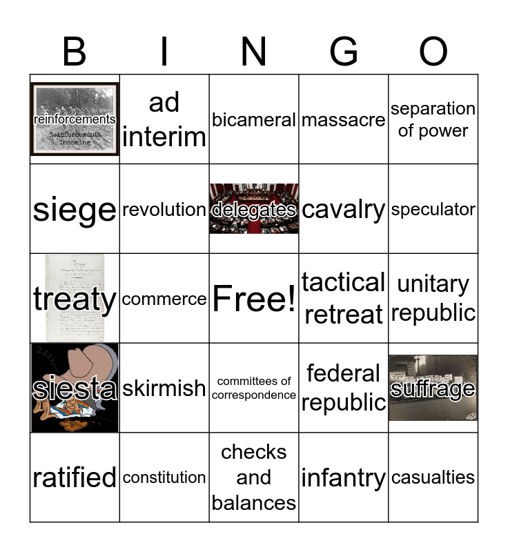 This bingo card has 5 images, a free space and 24 words: skirmish, constitution, delegates, ratified, separation of power, reinforcements, siege, ad interim, tactical retreat, committees of correspondence, cavalry, treaty, federal republic, suffrage, revolution, infantry, unitary republic, bicameral, speculator, commerce, casualties, siesta, massacre and checks and balances.