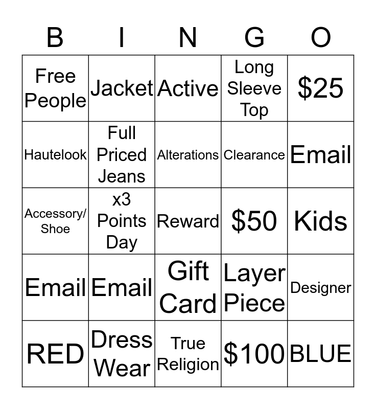 This bingo card has a free space and 24 words: Email, Dress Wear, Alterations, RED, $25, Free People, Hautelook, Jacket, $50, Gift Card, Clearance, Accessory/ Shoe, Layer Piece, Designer, Full Priced Jeans, $100, Kids, Active, Email, x3 Points Day, BLUE, Email, Long Sleeve Top and True Religion.