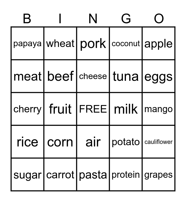 This bingo card has a free space and 34 words: strawberry, protein, broccoli, vitamins, rice, beef, apple, sugar, wheat, fish, cheese, pork, beans, bread, milk, eggs, carrot, cherry, corn, potato, air, water, papaya, mango, pasta, grapes, coconut, avocado, tuna, meat, vegetables, fruit, cauliflower and tofu.