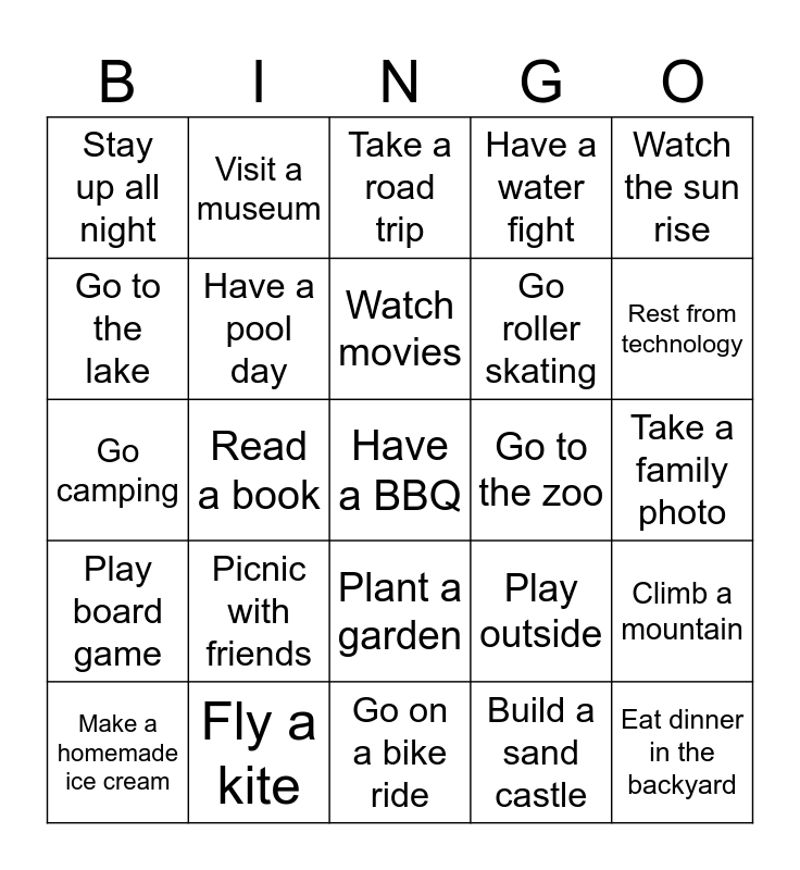 This bingo card has 25 words: Picnic with friends, Go on a bike ride, Watch movies, Make a homemade ice cream, Watch the sun rise, Stay up all night, Go to the lake, Visit a museum, Go to the zoo, Plant a garden, Go roller skating, Go camping, Play outside, Climb a mountain, Have a pool day, Eat dinner in the backyard, Take a family photo, Take a road trip, Rest from technology, Read a book, Have a BBQ, Fly a kite, Play board game, Have a water fight and Build a sand castle.