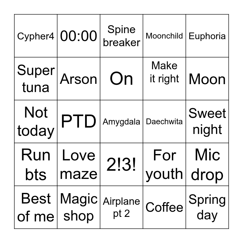 This bingo card has a free space and 24 words: Love maze, Magic shop, On, Best of me, Euphoria, Cypher4, Super tuna, 00:00, Daechwita, 2!3!, Make it right, Not today, For youth, Mic drop, Arson, Coffee, Sweet night, Spine breaker, Moon, PTD, Spring day, Run bts, Moonchild and Airplane pt 2.