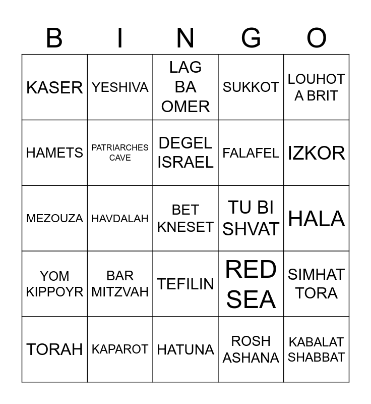 This bingo card has a free space and 24 words: BAR MITZVAH, KAPAROT, DEGEL ISRAEL, TORAH, LOUHOT A BRIT, KASER, HAMETS, YESHIVA, TU BI SHVAT, TEFILIN, FALAFEL, MEZOUZA, RED SEA, SIMHAT TORA, PATRIARCHES CAVE, ROSH ASHANA, HALA, LAG BA OMER, IZKOR, HAVDALAH, KABALAT SHABBAT, YOM KIPPOYR, SUKKOT and HATUNA.