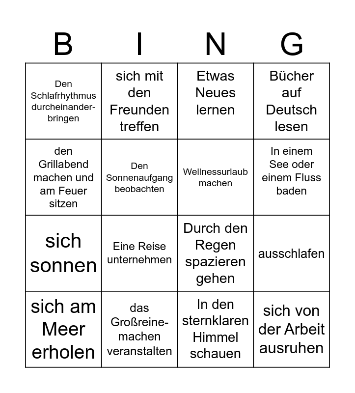 This bingo card has 16 words: das Großreine-machen veranstalten, ausschlafen, Etwas Neues lernen, Den Schlafrhythmus durcheinander-bringen, sich sonnen, sich mit den Freunden treffen, Durch den Regen spazieren gehen, In den sternklaren Himmel schauen, den Grillabend machen und am Feuer sitzen, Den Sonnenaufgang beobachten, sich am Meer erholen, Bücher auf Deutsch lesen, Eine Reise unternehmen, In einem See oder einem Fluss baden, Wellnessurlaub machen and sich von der Arbeit ausruhen.