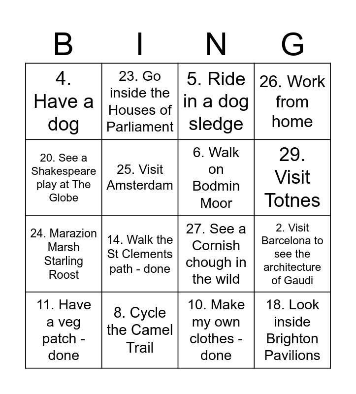 This bingo card has 31 words: Free!, 1. Start a blog - done, 2. Visit Barcelona to see the architecture of Gaudi, 3. Go horse riding, 4. Have a dog, 5. Ride in a dog sledge, 6. Walk on Bodmin Moor, 7. Learn the Cornish language, 8. Cycle the Camel Trail, 9. Walk the Cornish Coastal path - started, 10. Make my own clothes - done, 11. Have a veg patch - done, 12. Go to Ikea ( I have never been to one!), 13. Make a double wedding ring quilt, 14. Walk the St Clements path - done, 15. Visit the Barbara Hepworth studio - done, 16. Visit Kew Gardens, 17. Celebrate May Day at the Obby Oss, 18. Look inside Brighton Pavilions, 19. Walk around the Merry Maidens/Men an Tol, 20. See a Shakespeare play at The Globe, 21. See the Northern Lights/visit Iceland, 22. Create a wildlife garden - started, 23. Go inside the Houses of Parliament, 24. Marazion Marsh Starling Roost, 25. Visit Amsterdam, 26. Work from home, 27. See a Cornish chough in the wild, 28. See the London School of Samba at Notting Hill Carnaval, 29. Visit Totnes and 30. Go to a Pixies gig - done.
