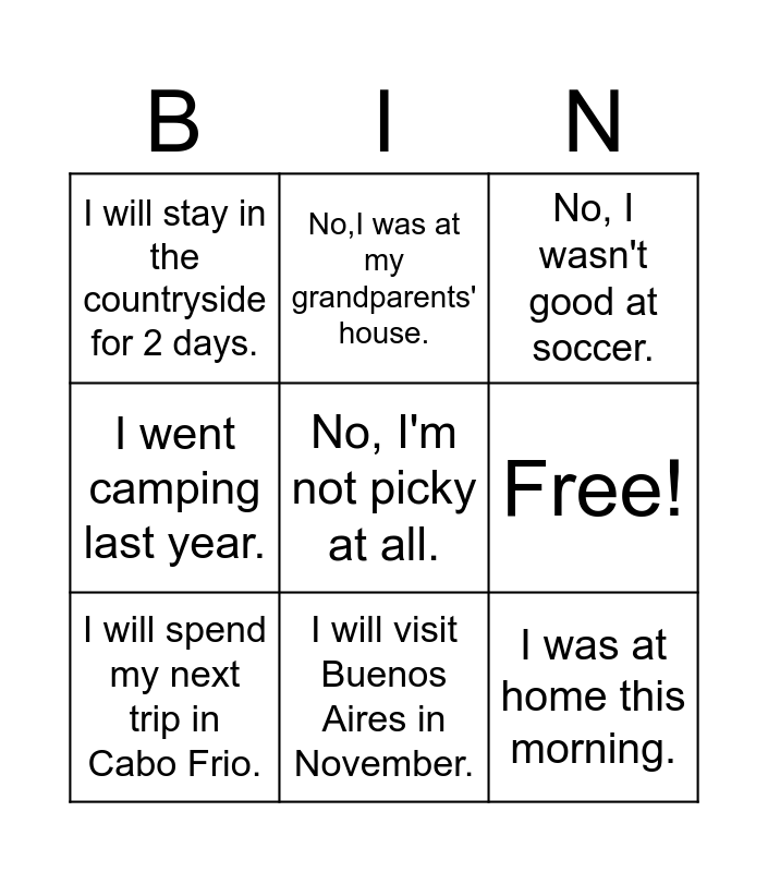 This bingo card has 28 words: I was born in Canada., My father was born in Italy., I was at home this morning., It was raining yesterday., Free!, No, I wasn't good at soccer., No,I was at my grandparents' house., No, I was very happy., Yes, I was great at math., No, I wasn't a scout., Yes, they were camping with me., I went camping last year., Yes, I was at my cousin's house., No, I don't. I have to do the dishes., Yes, I do. My routine is very tight., Yes, I'll go to Korea., No, I'm looking for trpis to another country., I will spend my next trip in Cabo Frio., I will visit Buenos Aires in November., I will spend my next vacation at home., I will stay in the countryside for 2 days., Yes, I will travek with them next semester., I will be back home at 1 o'clock., Yes, I will take a French course., No, I won't go on an exchange program., Yes, my room is very messy., No, I'm not picky at all. and I need to improve in Science..