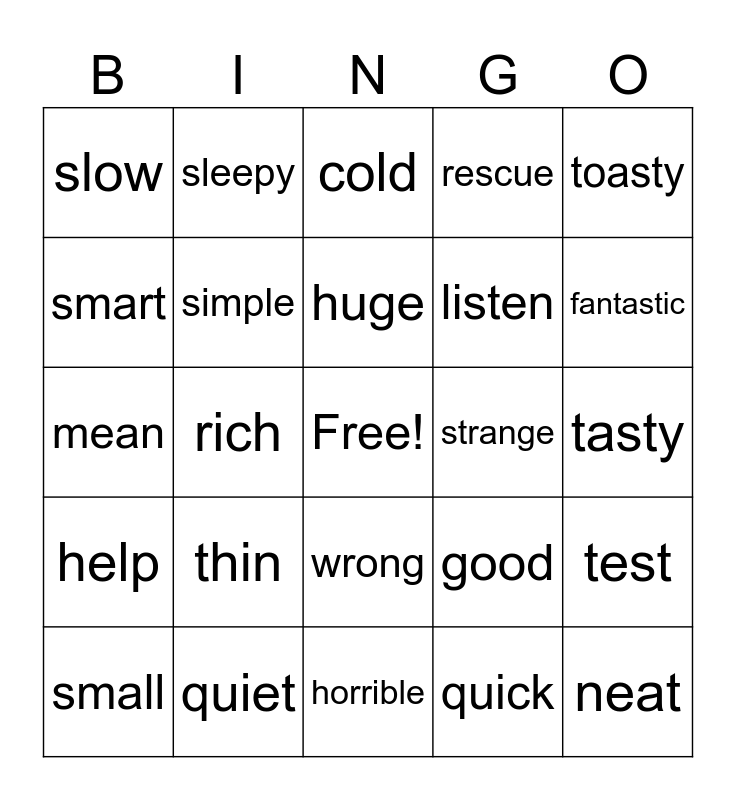 This bingo card has a free space and 24 words: small, thin, huge, quick, toasty, slow, sleepy, cold, strange, tasty, mean, simple, good, test, smart, quiet, horrible, rescue, fantastic, help, rich, wrong, listen and neat.