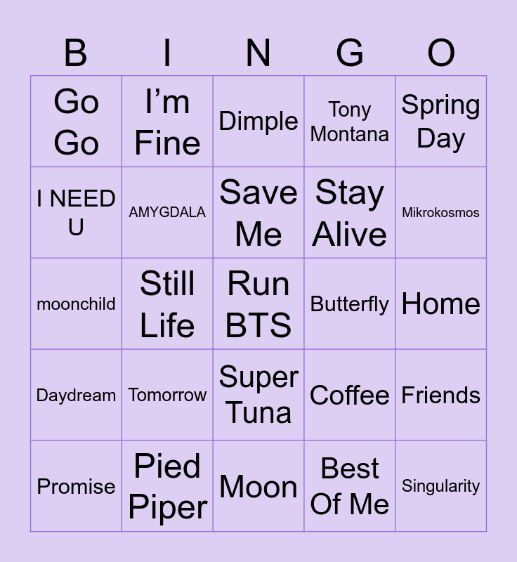 This bingo card has 25 words: Tomorrow, Moon, Save Me, Promise, Spring Day, Go Go, I NEED U, I’m Fine, Butterfly, Super Tuna, Stay Alive, moonchild, Coffee, Friends, AMYGDALA, Singularity, Home, Dimple, Mikrokosmos, Still Life, Run BTS, Pied Piper, Daydream, Tony Montana and Best Of Me.