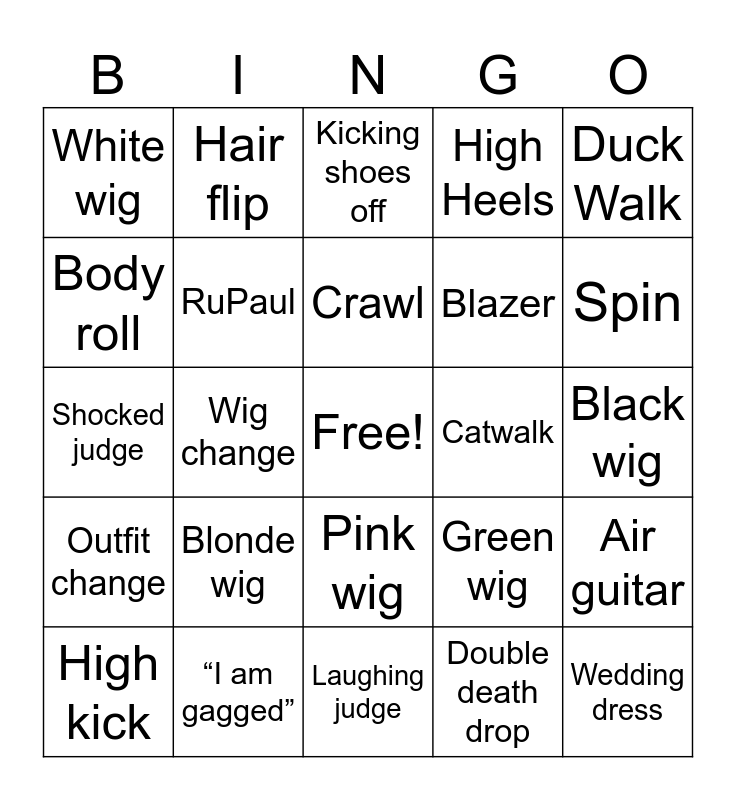 This bingo card has a free space and 33 words: Death drop, Lip-syncing, Wig change, Split, Outfit change, RuPaul, Duck Walk, High kick, Hair flip, Spin, Crawl, Kicking shoes off, Lady Gaga song, Ad break, Catwalk, Spin, “I am gagged”, Shocked judge, Blonde wig, Green wig, Pink wig, Yellow wig, White wig, Black wig, Laughing judge, Wedding dress, High Heels, Blazer, Body roll, Air guitar, Flowers in hair, Double death drop and Sparkly outfit.