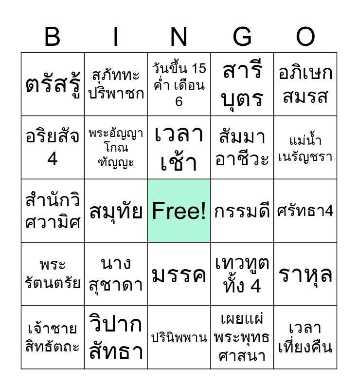 This bingo card has a free space and 24 words: เจ้าชายสิทธัตถะ, นางสุชาดา, เวลาเช้า, เผยแผ่พระพุทธศาสนา, อภิเษกสมรส, ตรัสรู้, สุภัททะปริพาชก, วันขึ้น 15 ค่ำ เดือน 6, กรรมดี, ศรัทธา4, สำนักวิศวามิศ, พระอัญญาโกณฑัญญะ, เทวทูตทั้ง 4, ราหุล, อริยสัจ 4, วิปากสัทธา, ปรินิพพาน, สารีบุตร, แม่น้ำเนรัญชรา, พระรัตนตรัย, สมุทัย, มรรค, สัมมาอาชีวะ and เวลาเที่ยงคืน.