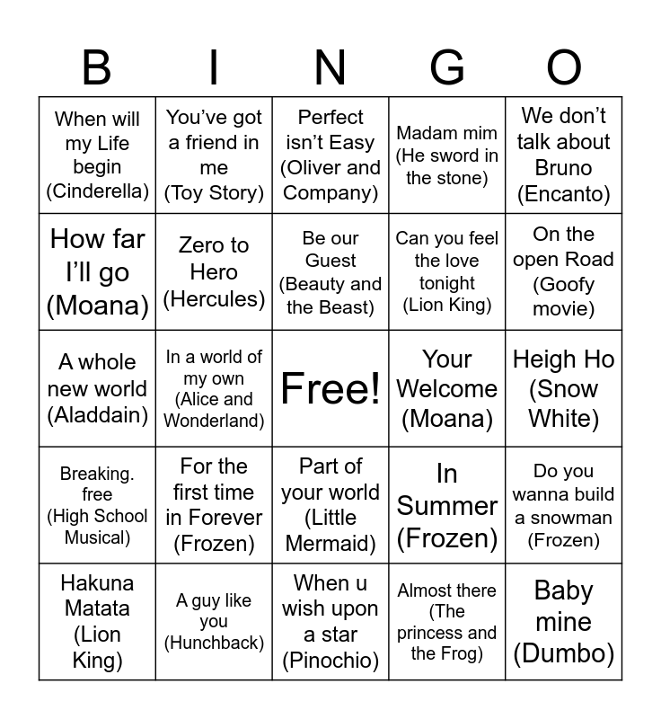 This bingo card has a free space and 24 words: For the first time in Forever (Frozen), A guy like you (Hunchback), Be our Guest (Beauty and the Beast), Hakuna Matata (Lion King), We don’t talk about Bruno (Encanto), When will my Life begin (Cinderella), How far I’ll go (Moana), You’ve got a friend in me (Toy Story), Your Welcome (Moana), Part of your world (Little Mermaid), Can you feel the love tonight (Lion King), A whole new world (Aladdain), In Summer (Frozen), Do you wanna build a snowman (Frozen), Zero to Hero (Hercules), Almost there (The princess and the Frog), Heigh Ho (Snow White), Perfect isn’t Easy (Oliver and Company), On the open Road (Goofy movie), In a world of my own (Alice and Wonderland), Baby mine (Dumbo), Breaking. free (High School Musical), Madam mim (He sword in the stone) and When u wish upon a star (Pinochio).