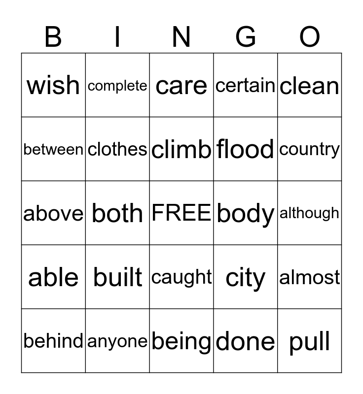 This bingo card has a free space and 24 words: built, anyone, climb, behind, clean, wish, between, complete, body, caught, flood, above, city, almost, clothes, done, although, care, country, both, pull, able, certain and being.
