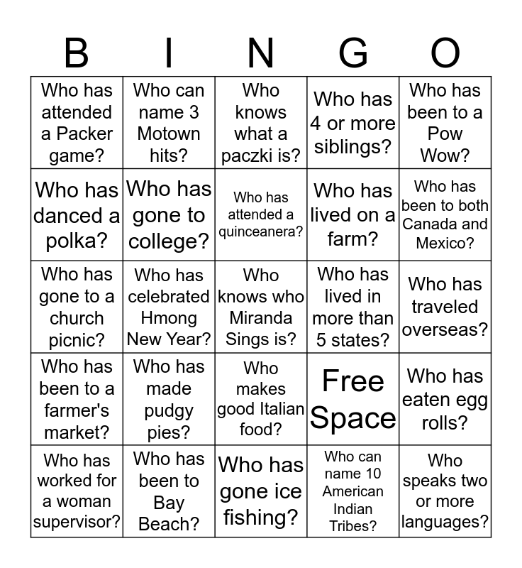 This bingo card has 25 words: Who has made pudgy pies?, Who has gone ice fishing?, Who has attended a quinceanera?, Who has worked for a woman supervisor?, Who has been to a Pow Wow?, Who has attended a Packer game?, Who has danced a polka?, Who can name 3 Motown hits?, Who has lived in more than 5 states?, Who makes good Italian food?, Who has lived on a farm?, Who has gone to a church picnic?, Free Space, Who has eaten egg rolls?, Who has gone to college?, Who speaks two or more languages?, Who has traveled overseas?, Who knows what a paczki is?, Who has been to both Canada and Mexico?, Who has celebrated Hmong New Year?, Who knows who Miranda Sings is?, Who has been to Bay Beach?, Who has been to a farmer's market?, Who has 4 or more siblings? and Who can name 10 American Indian Tribes?.