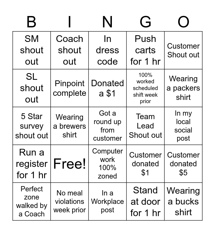 This bingo card has a free space and 25 words: Free!, In a Workplace post, Donated a $1, Perfect zone walked by a Coach, Customer Shout out, SM shout out, SL shout out, Coach shout out, Team Lead Shout out, Computer work 100% zoned, 100% worked scheduled shift week prior, 5 Star survey shout out, Customer donated $1, Customer donated $5, Pinpoint complete, Returns complete, In my local social post, In dress code, Wearing a packers shirt, Wearing a brewers shirt, Wearing a bucks shirt, No meal violations week prior, Run a register for 1 hr, Push carts for 1 hr and Stand at door for 1 hr.