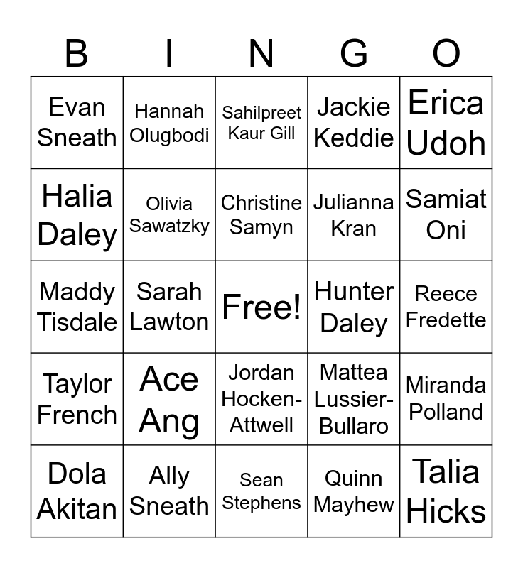 This bingo card has a free space and 24 words: Ace Ang, Ally Sneath, Christine Samyn, Dola Akitan, Erica Udoh, Evan Sneath, Halia Daley, Hannah Olugbodi, Hunter Daley, Jordan Hocken-Attwell, Julianna Kran, Maddy Tisdale, Mattea Lussier-Bullaro, Miranda Polland, Olivia Sawatzky, Quinn Mayhew, Reece Fredette, Sahilpreet Kaur Gill, Samiat Oni, Sarah Lawton, Talia Hicks, Taylor French, Jackie Keddie and Sean Stephens.