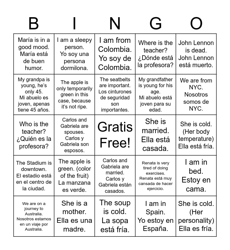 This bingo card has a free space and 29 words: We are on a journey to Australia. Nosotros estamos en un viaje por Australia., She is very pretty. Ella es muy bonita., Carlos and Gabriela are spouses. Carlos y Gabriela son esposos., The soccer game is in the Stadium. El juego de fútbol es en el estadio., María is in a good mood. María está de buen humor., I am from Colombia. Yo soy de Colombia., The apple is only temporarily green in this case, because it’s not ripe., The apple is green. (color of the fruit) La manzana es verde., She is married. Ella está casada., She is a mother. Ella es una madre., She is cold. (Her body temperature) Ella está fría., She is cold. (Her personality) Ella es fría., The soup is cold. La sopa está fría., I am in Spain. Yo estoy en España., We are from NYC. Nosotros somos de NYC., She is very beautiful tonight. Ella está muy hermosa esta noche., Carlos and Gabriela are married. Carlos y Gabriela están casados., The Stadium is downtown. El estadio está en el centro de la ciudad., John Lennon is dead. John Lennon está muerto., Who is the teacher? ¿Quién es la profesora?, Renata is very tired of doing exercises. Renata está muy cansada de hacer ejercicio., Renata is a very athletic person. Renata es una persona muy deportiva., My grandfather is young for his age. Mi abuelo está joven para su edad., My grandpa is young, he’s only 45. Mi abuelo es joven, apenas tiene 45 años., Where is the teacher? ¿Dónde está la profesora?, I am a sleepy person. Yo soy una persona dormilona., I am in bed. Estoy en cama., The seatbelts are important. Los cinturones de seguridad son importantes. and The seatbelts are in the car. Los cinturones de seguridad están en el carro..