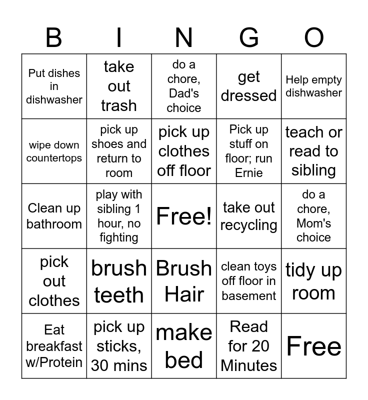This bingo card has a free space and 25 words: brush teeth, make bed, pick up clothes off floor, Eat breakfast w/Protein, Help empty dishwasher, Put dishes in dishwasher, wipe down countertops, take out trash, take out recycling, Brush Hair, Pick up stuff on floor; run Ernie, Clean up bathroom, clean toys off floor in basement, tidy up room, pick up shoes and return to room, dust island, do a chore, Mom's choice, do a chore, Dad's choice, teach or read to sibling, play with sibling 1 hour, no fighting, Free, pick up sticks, 30 mins, pick out clothes, get dressed and Read for 20 Minutes.