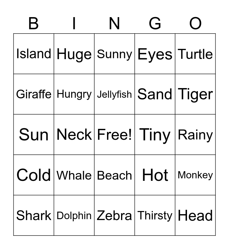 This bingo card has a free space and 24 words: Whale, Dolphin, Jellyfish, Shark, Turtle, Island, Giraffe, Huge, Tiny, Beach, Sand, Sun, Hot, Monkey, Hungry, Thirsty, Rainy, Sunny, Tiger, Neck, Head, Cold, Eyes and Zebra.