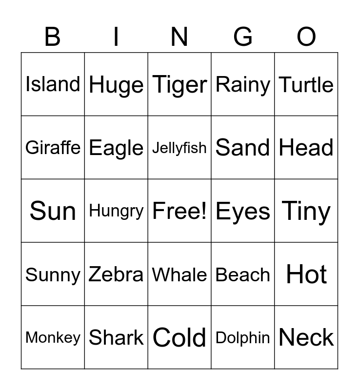 This bingo card has a free space and 26 words: Whale, Dolphin, Jellyfish, Shark, Turtle, Island, Giraffe, Huge, Tiny, Beach, Sand, Sun, Hot, Monkey, Hungry, Thirsty, Rainy, Sunny, Tiger, Neck, Head, Cold, Eyes, Zebra, Eagle and Stormy.