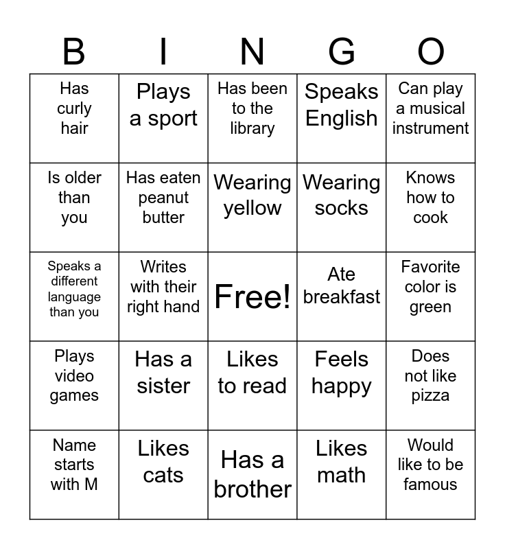 This bingo card has a free space and 24 words: Has a sister, Likes cats, Wearing yellow, Name starts with M, Can play a musical instrument, Has curly hair, Is older than you, Plays a sport, Ate breakfast, Likes to read, Wearing socks, Speaks a different language than you, Feels happy, Does not like pizza, Has eaten peanut butter, Likes math, Favorite color is green, Has been to the library, Knows how to cook, Writes with their right hand, Would like to be famous, Plays video games, Speaks English and Has a brother.