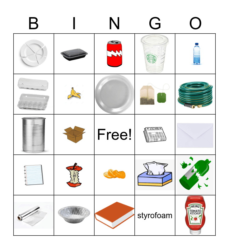 This bingo card has 24 images, a free space and 1 words: styrofoam.