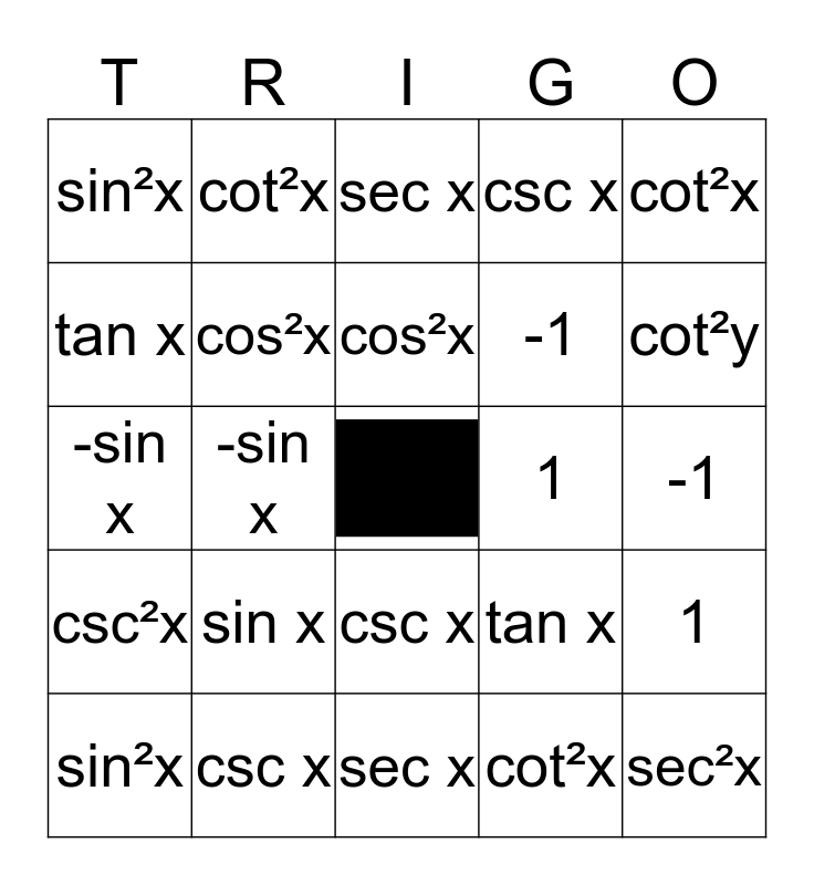 This bingo card has a free space and 24 words: sin x, csc x, cos²x, sin²x, cot²x, sin²x, tan x, cot²x, 1, csc x, -1, -sin x, tan x, 1, cos²x, cot²x, -1, sec x, cot²y, -sin x, sec²x, csc²x, csc x and sec x.