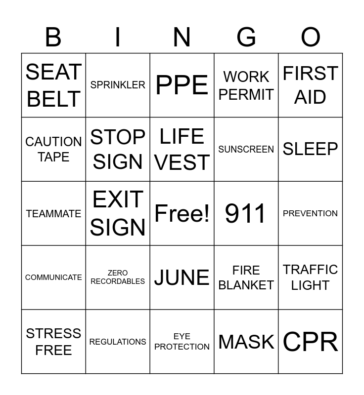 This bingo card has a free space and 49 words: SMOKE DETECTOR, CPR, LONG SLEEVE SHIRT, EYE PROTECTION, ZERO RECORDABLES, LADDER, SPRINKLER, FIRE EXTINGUISHER, CAUTION TAPE, SAFETY CONE, STOP SIGN, WORK PERMIT, TRAFFIC LIGHT, FIRE BLANKET, GLOVES, ALARM, LIFE VEST, 911, HARD HAT, FIRST AID, EXIT SIGN, MASK, SEAT BELT, SUNSCREEN, NON SLIP, SLEEP, STRESS FREE, MENTAL HEALTH, JUNE, COMMUNICATE, CAUTION, PROCEDURES, RISK, LIGHTING, REGULATIONS, SAFETY BOOTS, HAZARD, TRAINING, PREVENTION, WELLNESS, RESPONSIBILITY, COMPLIANCE, IMPROVEMENT, REPORTING, TEAMMATE, PPE, INJURY, HYDRATE and RULES.