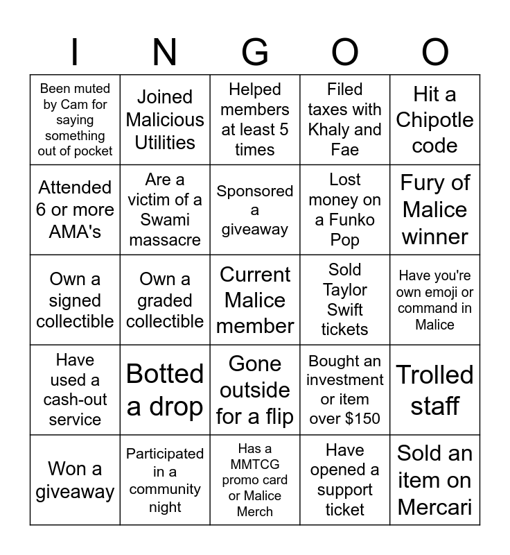This bingo card has a free space and 24 words: Botted a drop, Participated in a community night, Sponsored a giveaway, Won a giveaway, Hit a Chipotle code, Been muted by Cam for saying something out of pocket, Attended 6 or more AMA's, Joined Malicious Utilities, Sold Taylor Swift tickets, Gone outside for a flip, Lost money on a Funko Pop, Own a signed collectible, Bought an investment or item over $150, Trolled staff, Are a victim of a Swami massacre, Have opened a support ticket, Have you're own emoji or command in Malice, Helped members at least 5 times, Fury of Malice winner, Own a graded collectible, Sold an item on Mercari, Have used a cash-out service, Filed taxes with Khaly and Fae and Has a MMTCG promo card or Malice Merch.