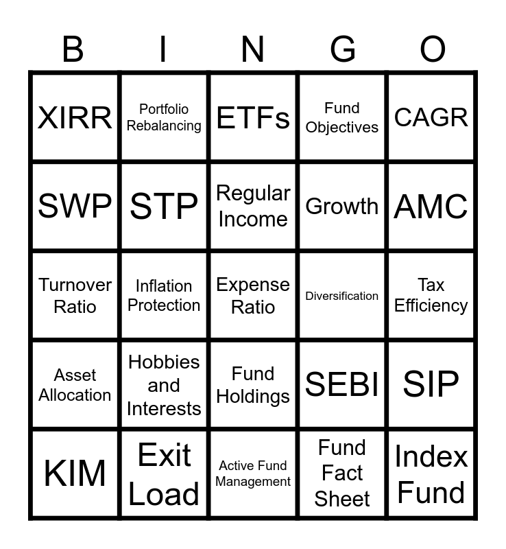 This bingo card has 25 words: Asset Allocation, Exit Load, Expense Ratio, Fund Fact Sheet, CAGR, XIRR, Portfolio Rebalancing, ETFs, Diversification, SIP, SWP, STP, Active Fund Management, SEBI, AMC, KIM, Inflation Protection, Regular Income, Growth, Tax Efficiency, Turnover Ratio, Hobbies and Interests, Fund Holdings, Fund Objectives and Index Fund.