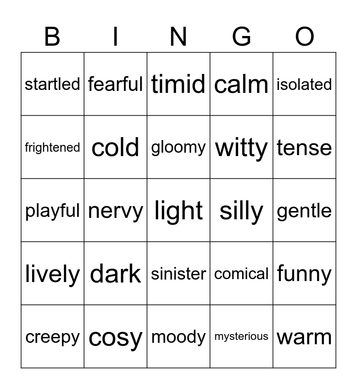 This bingo card has 25 words: dark, moody, gloomy, creepy, isolated, startled, frightened, fearful, silly, sinister, witty, playful, comical, funny, cold, warm, gentle, timid, tense, nervy, light, cosy, lively, calm and mysterious.