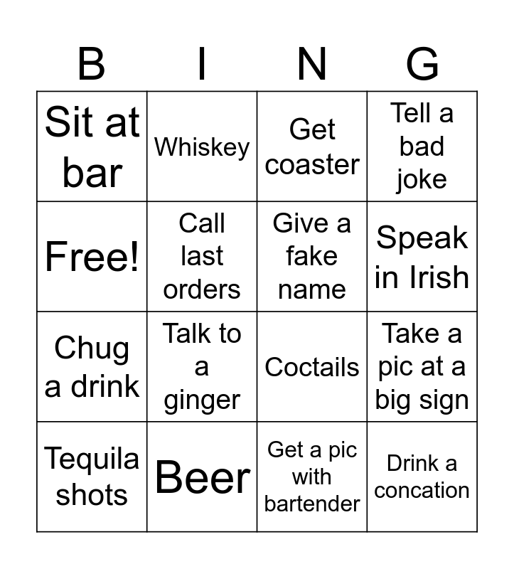 This bingo card has 16 words: Beer, Take a pic at a big sign, Get coaster, Sit at bar, Chug a drink, Whiskey, Coctails, Get a pic with bartender, Free!, Call last orders, Tequila shots, Tell a bad joke, Talk to a ginger, Speak in Irish, Give a fake name and Drink a concation.