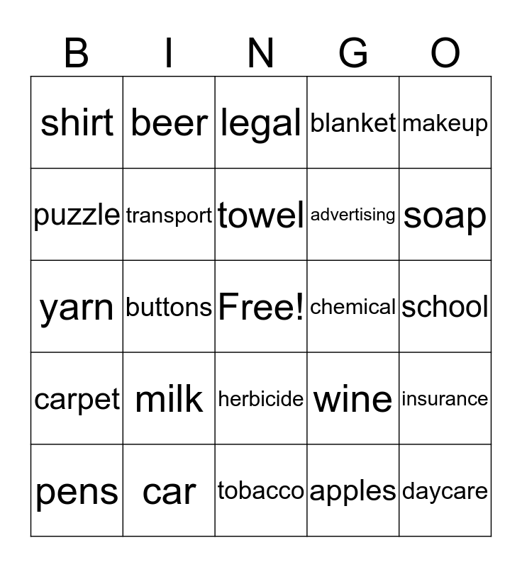 This bingo card has a free space and 24 words: milk, car, towel, pens, makeup, shirt, puzzle, beer, chemical, herbicide, advertising, yarn, wine, insurance, transport, apples, school, legal, soap, buttons, daycare, carpet, blanket and tobacco.