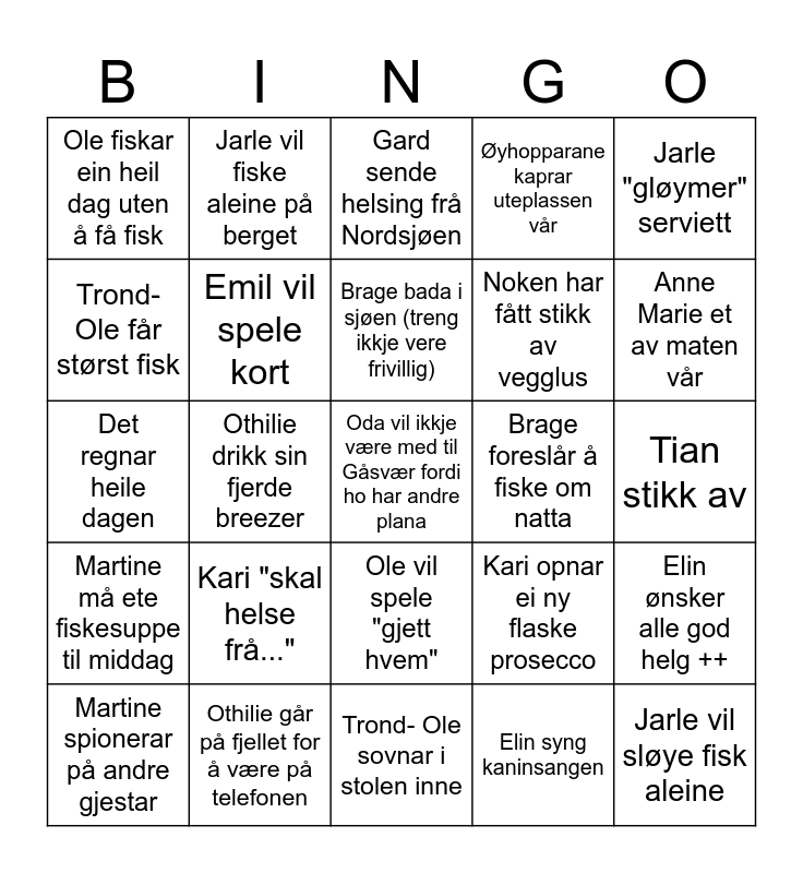 This bingo card has a free space and 24 words: Kari "skal helse frå...", Othilie går på fjellet for å være på telefonen, Brage bada i sjøen (treng ikkje vere frivillig), Martine spionerar på andre gjestar, Jarle "gløymer" serviett, Ole fiskar ein heil dag uten å få fisk, Trond-Ole får størst fisk, Jarle vil fiske aleine på berget, Brage foreslår å fiske om natta, Ole vil spele "gjett hvem", Noken har fått stikk av vegglus, Det regnar heile dagen, Kari opnar ei ny flaske prosecco, Elin ønsker alle god helg ++, Emil vil spele kort, Elin syng kaninsangen, Tian stikk av, Gard sende helsing frå Nordsjøen, Anne Marie et av maten vår, Othilie drikk sin fjerde breezer, Jarle vil sløye fisk aleine, Martine må ete fiskesuppe til middag, Øyhopparane kaprar uteplassen vår and Trond- Ole sovnar i stolen inne.