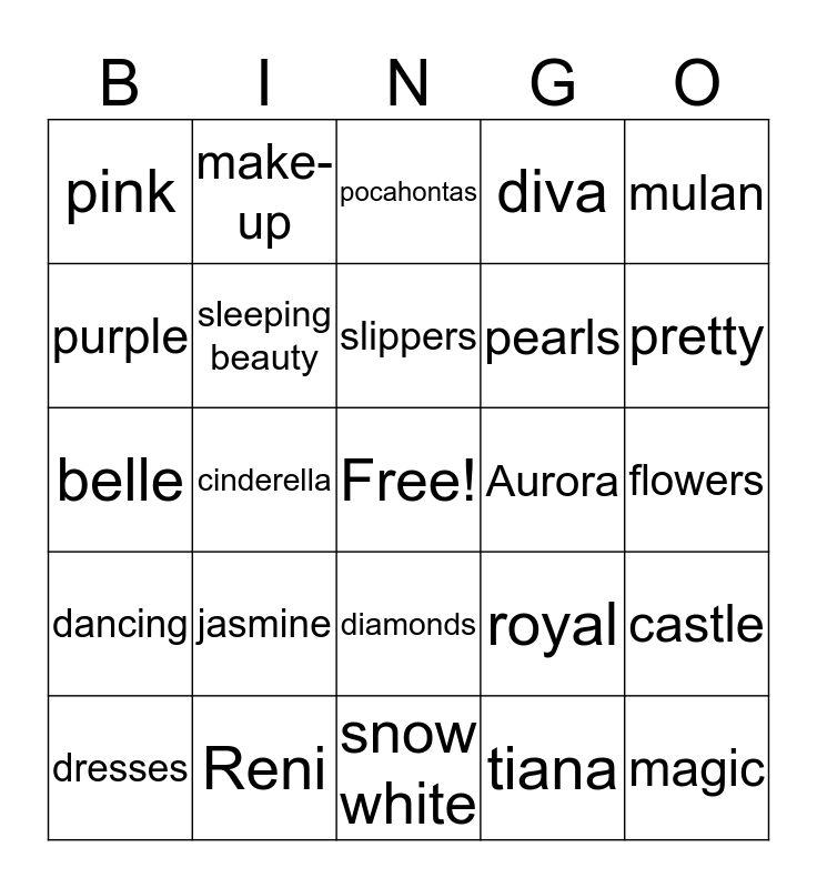 This bingo card has a free space and 24 words: jasmine, Reni, slippers, dresses, mulan, pink, purple, make-up, Aurora, diamonds, pearls, belle, royal, castle, sleeping beauty, tiana, flowers, pocahontas, pretty, cinderella, magic, dancing, diva and snow white.