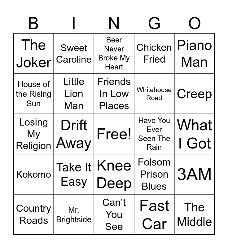 This bingo card has a free space and 47 words: Kryptonite, The Middle, Wagon Wheel, Can’t You See, Take It Easy, On The Road Again, Sweet Caroline, Knockin’ On Heaven’s Door, House of the Rising Sun, Drive - Incubus, Little Lion Man, Chicken Fried, 3AM, Folsom Prison Blues, Good Riddance (Time of Your Life), Brown Eyed Girl, Friends In Low Places, Have You Ever Seen The Rain, Sweet Home Alabama, Piano Man, Drift Away, Fast Car, The Joker, Whitehouse Road, The Weight - The Band, Creep, Country Roads, Jessie’s Girl, Knee Deep, Kokomo, Ho Hey, Tennessee Whiskey, Brandy - Looking Glass, All Along The Watchtower, Island In The Sun, Mr. Brightside, What I Got, Something In The Orange, Viva La Vida, Blister In The Sun, Boys of Summer, Beer Never Broke My Heart, Losing My Religion, Neon Moon, American Girl, Sitting, Waiting, Wishing and Cocaine.