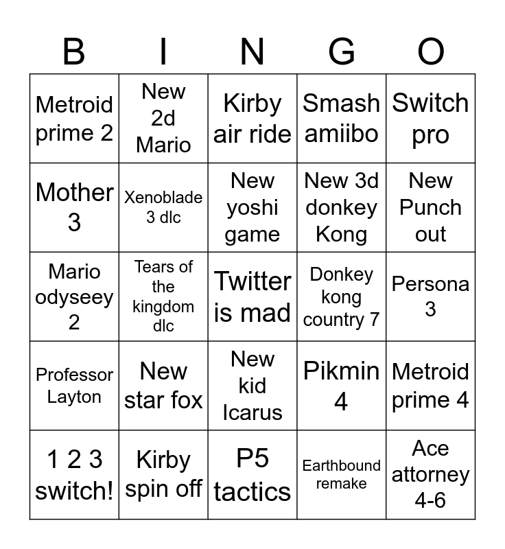 This bingo card has a free space and 24 words: New star fox, Kirby spin off, New yoshi game, 1 2 3 switch!, Switch pro, Metroid prime 2, Mother 3, New 2d Mario, Donkey kong country 7, New kid Icarus, New 3d donkey Kong, Mario odyseey 2, Pikmin 4, Metroid prime 4, Xenoblade 3 dlc, Earthbound remake, Persona 3, Kirby air ride, New Punch out, Tears of the kingdom dlc, Ace attorney 4-6, Professor Layton, Smash amiibo and P5 tactics.
