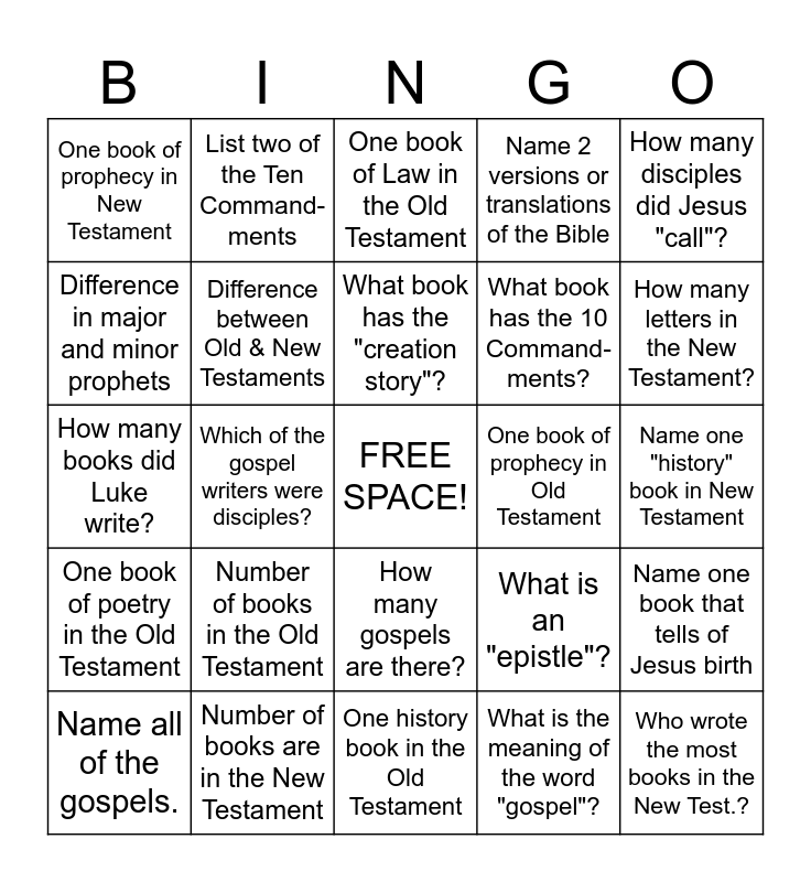 This bingo card has a free space and 24 words: Number of books in the Old Testament, Number of books are in the New Testament, What book has the "creation story"?, Name all of the gospels., How many disciples did Jesus "call"?, One book of prophecy in New Testament, Difference in major and minor prophets, List two of the Ten Command-ments, One book of prophecy in Old Testament, How many gospels are there?, What book has the 10 Command-ments?, How many books did Luke write?, What is an "epistle"?, Name one book that tells of Jesus birth, Difference between Old & New Testaments, What is the meaning of the word "gospel"?, Name one "history" book in New Testament, One book of Law in the Old Testament, How many letters in the New Testament?, Which of the gospel writers were disciples?, Who wrote the most books in the New Test.?, One book of poetry in the Old Testament, Name 2 versions or translations of the Bible and One history book in the Old Testament.