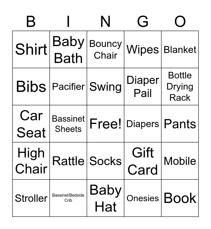 This bingo card has a free space and 34 words: Sleepers/Footies, Onesies, Bath Towel, Baby Shampoo, High Chair, Pacifier, Blanket, Stroller, Baby Bath, Play Mat, Swing, Bouncy Chair, Playpen, Swing, Diapers, Bottle Drying Rack, Bassinet/Bedside Crib, Car Seat, Rattle, Gift Card, Socks, Shoes, Shirt, Pants, Baby Hat, Book, Wipes, Thermometer, Diaper Pail, Bibs, Nasal Aspirator, Bassinet Sheets, Mobile and Baby Spoon.