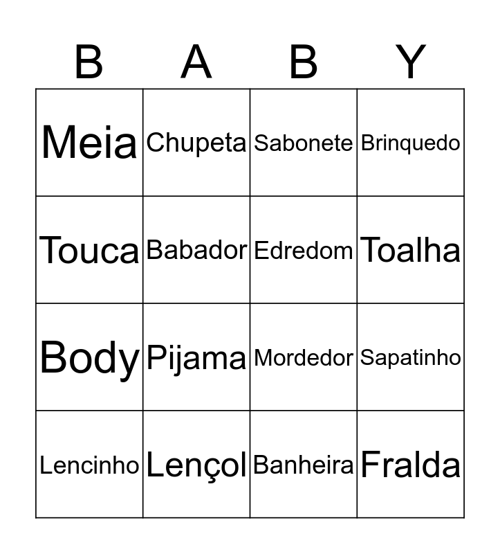 This bingo card has a free space and 26 words: Shampoo, Colonia, Toalha, Luva, Touca, Meia, Babador, Chupeta, Banheira, Trocador, Body, Fralda, Cueiro, Macacão, Sapatinho, Mamadeira, Brinquedo, Conjunto pagão, Sabonete, Lencinho, Pijama, Fronha, Lençol, Cobertor, Edredom and Manta.