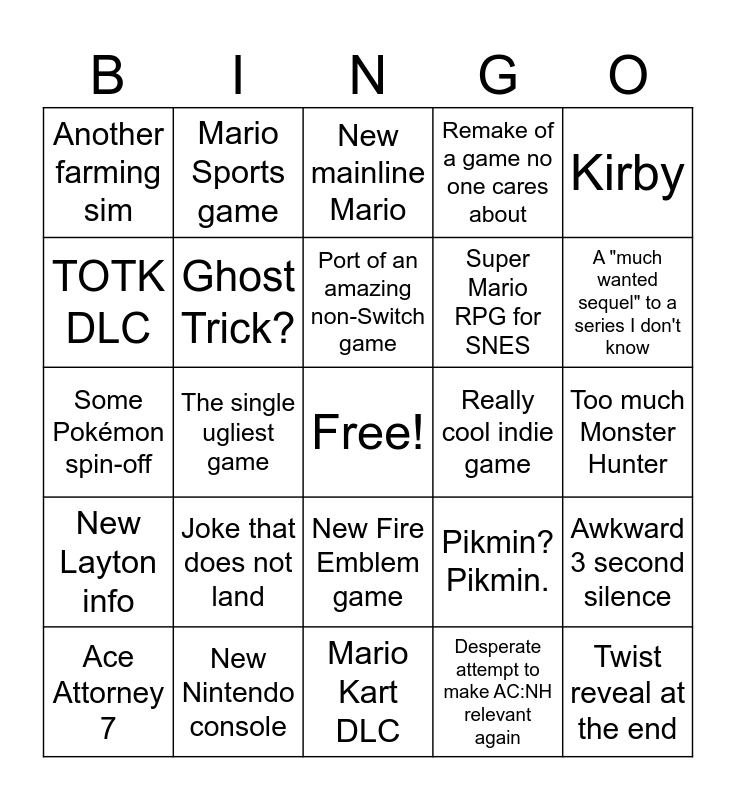 This bingo card has a free space and 24 words: Joke that does not land, New Nintendo console, Port of an amazing non-Switch game, Ace Attorney 7, Kirby, Another farming sim, TOTK DLC, Mario Sports game, Really cool indie game, New Fire Emblem game, Super Mario RPG for SNES, Some Pokémon spin-off, Pikmin? Pikmin., Awkward 3 second silence, Ghost Trick?, Desperate attempt to make AC:NH relevant again, Too much Monster Hunter, New mainline Mario, A "much wanted sequel" to a series I don't know, The single ugliest game, Twist reveal at the end, New Layton info, Remake of a game no one cares about and Mario Kart DLC.