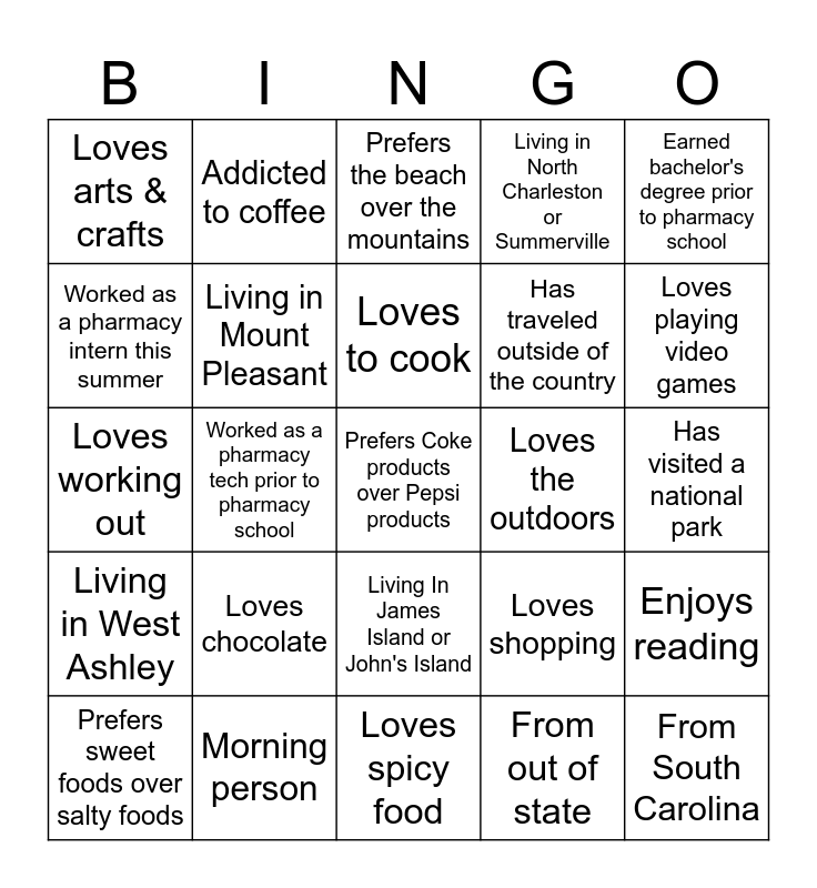 This bingo card has a free space and 35 words: Plays a musical instrument, Played club or intramural sports in undergrad, Loves to travel, Living in Mount Pleasant, Living In James Island or John's Island, Living in North Charleston or Summerville, Worked as a pharmacy intern this summer, Living in downtown Charleston, Loves to cook, Chemistry major in undergrad, Loves working out, Earned bachelor's degree prior to pharmacy school, Night owl, Living with a fur-baby, Loves arts & crafts, Loves the outdoors, From out of state, Worked as a pharmacy tech prior to pharmacy school, Living in West Ashley, From South Carolina, Loves shopping, Prefers sweet foods over salty foods, Enjoys reading, Morning person, Prefers the beach over the mountains, Loves playing video games, Loves reality TV shows, Biology major in undergrad, Has traveled outside of the country, Has visited a national park, Binge watches shows, Loves spicy food, Loves chocolate, Addicted to coffee and Speaks more than one language.