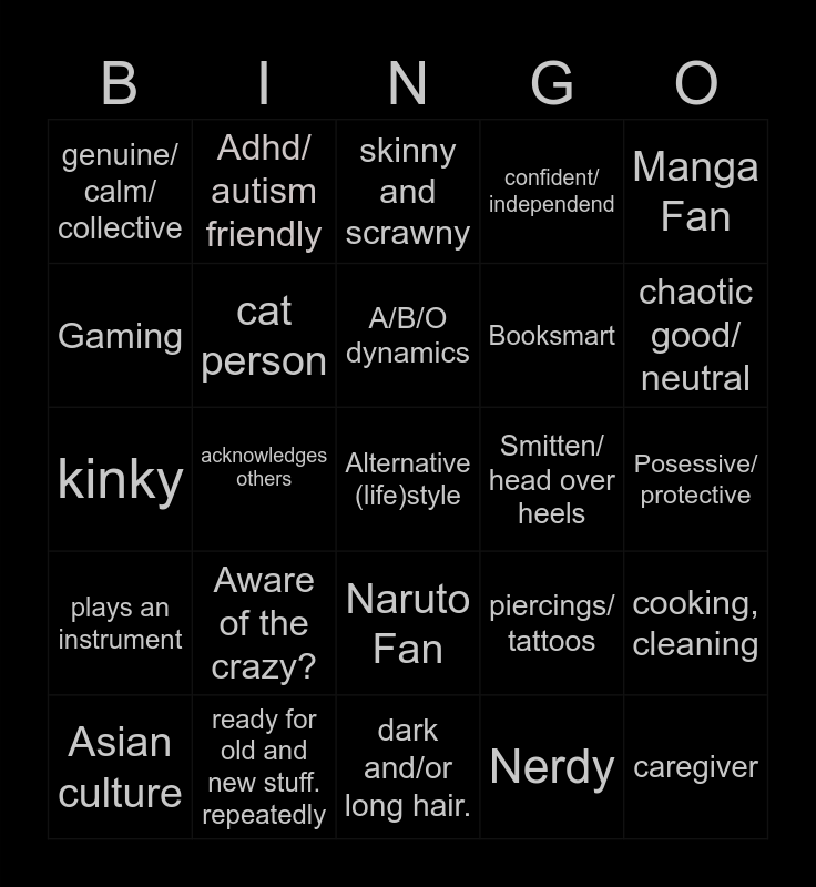 This bingo card has 25 words: plays an instrument, ready for old and new stuff. repeatedly, Alternative (life)style, Nerdy, Manga Fan, genuine/ calm/ collective, Adhd/ autism friendly, skinny and scrawny, Smitten/ head over heels, cooking, cleaning, Gaming, cat person, dark and/or long hair., piercings/ tattoos, chaotic good/ neutral, Asian culture, acknowledges others, A/B/O dynamics, Booksmart, Posessive/ protective, kinky, Aware of the crazy?, Naruto Fan, confident/ independend and caregiver.