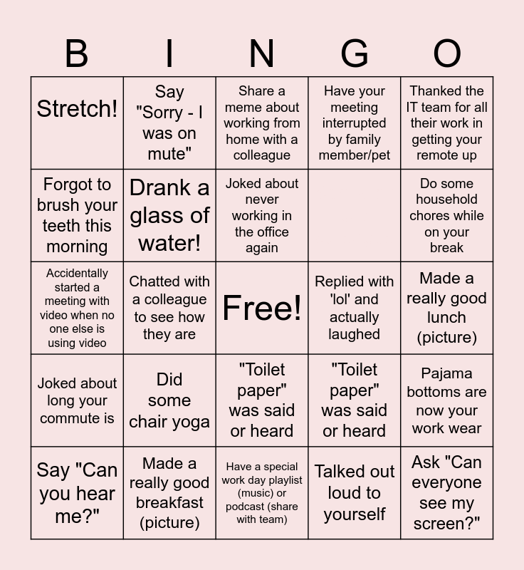 This bingo card has a free space and 25 words: Say "Can you hear me?", Did some chair yoga, Joked about never working in the office again, Talked out loud to yourself, Do some household chores while on your break, Stretch!, Say "Sorry - I was on mute", Share a meme about working from home with a colleague, Sent a gif to a colleague, Pajama bottoms are now your work wear, Accidentally started a meeting with video when no one else is using video, Drank a glass of water!, "Toilet paper" was said or heard, Ask "Can everyone see my screen?", Forgot to brush your teeth this morning, Made a really good breakfast (picture), Have a special work day playlist (music) or podcast (share with team), Have your meeting interrupted by family member/pet, Made a really good lunch (picture), Joked about long your commute is, Chatted with a colleague to see how they are, "Toilet paper" was said or heard, Replied with 'lol' and actually laughed, Thanked the IT team for all their work in getting your remote up and Give a coworker a shout out in huddle.