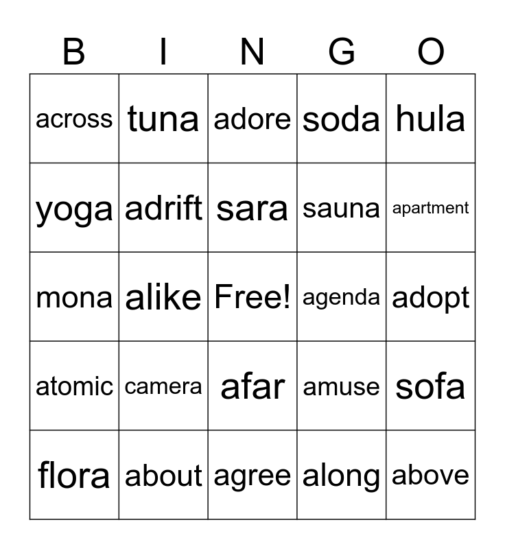 This bingo card has a free space and 30 words: about, away, alike, academy, across, adore, adrift, afar, agenda, agree, adopt, above, along, among, apartment, aloof, amuse, atomic, camera, hula, mona, panda, tuna, sauna, yoga, soda, sofa, flora, sara and cola.