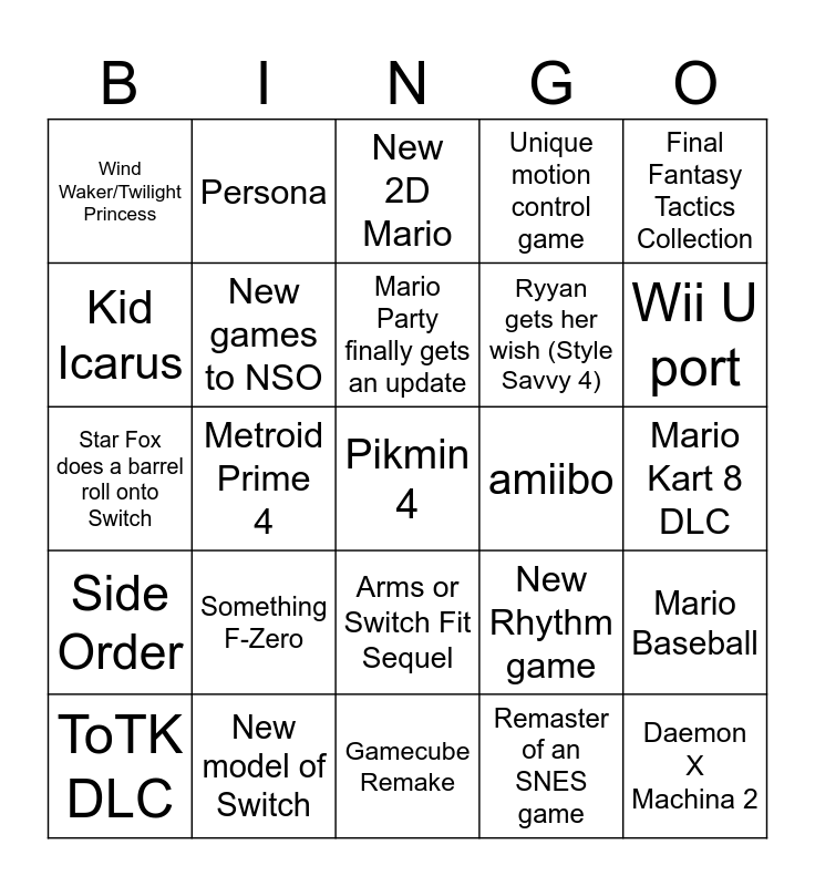 This bingo card has a free space and 29 words: ToTK DLC, Golden Sun, Metroid Prime 4, Silksong Release Date, Wind Waker/Twilight Princess, New 2D Mario, New games to NSO, Something F-Zero, amiibo, New model of Switch, Mario Kart 8 DLC, Daemon X Machina 2, Gamecube Remake, Remaster of an SNES game, Wii U port, Return of Labo, Arms or Switch Fit Sequel, Side Order, Final Fantasy Tactics Collection, Star Fox does a barrel roll onto Switch, New Rhythm game, New Yoshi Game, Ryyan gets her wish (Style Savvy 4), Kid Icarus, Unique motion control game, Persona, Mario Baseball, Mario Party finally gets an update and Miis.