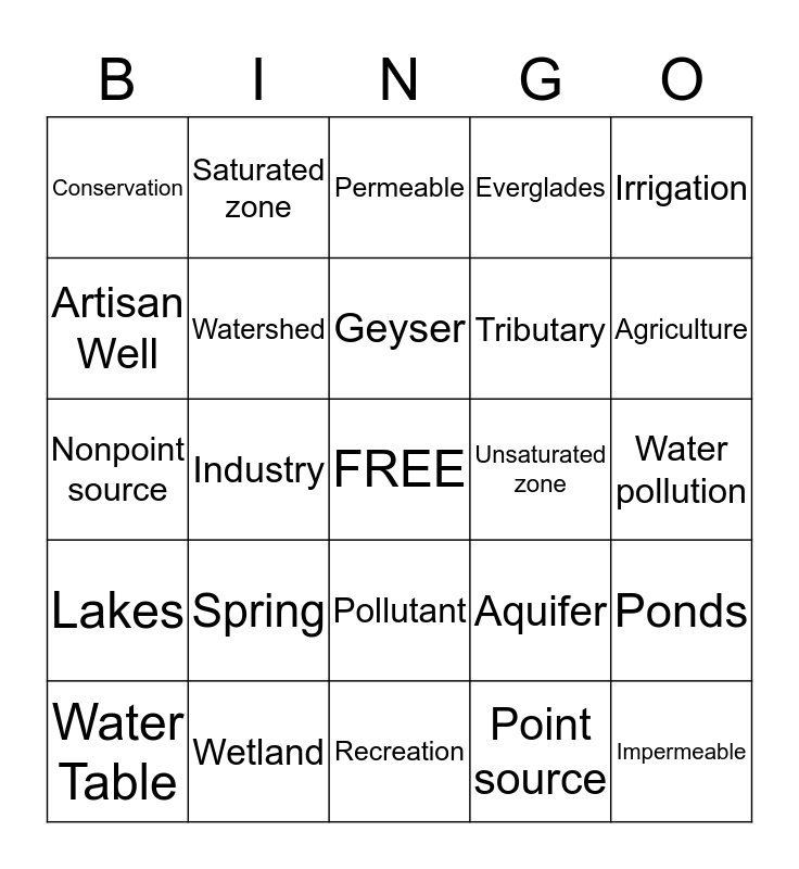 This bingo card has a free space and 24 words: Spring, Wetland, Geyser, Water Table, Irrigation, Conservation, Artisan Well, Saturated zone, Unsaturated zone, Pollutant, Tributary, Nonpoint source, Aquifer, Ponds, Watershed, Point source, Water pollution, Permeable, Agriculture, Industry, Impermeable, Lakes, Everglades and Recreation.