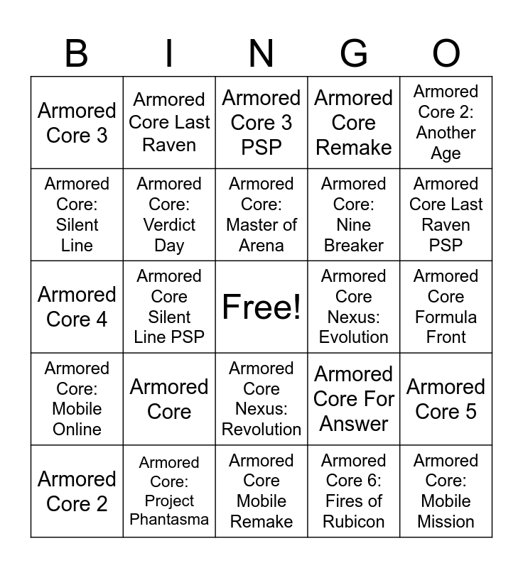 This bingo card has a free space and 24 words: Armored Core, Armored Core: Project Phantasma, Armored Core: Master of Arena, Armored Core 2, Armored Core 2: Another Age, Armored Core 3, Armored Core: Silent Line, Armored Core Last Raven, Armored Core Nexus: Evolution, Armored Core Nexus: Revolution, Armored Core: Nine Breaker, Armored Core 4, Armored Core For Answer, Armored Core 5, Armored Core: Verdict Day, Armored Core 6: Fires of Rubicon, Armored Core Formula Front, Armored Core 3 PSP, Armored Core Last Raven PSP, Armored Core Silent Line PSP, Armored Core: Mobile Mission, Armored Core: Mobile Online, Armored Core Remake and Armored Core Mobile Remake.